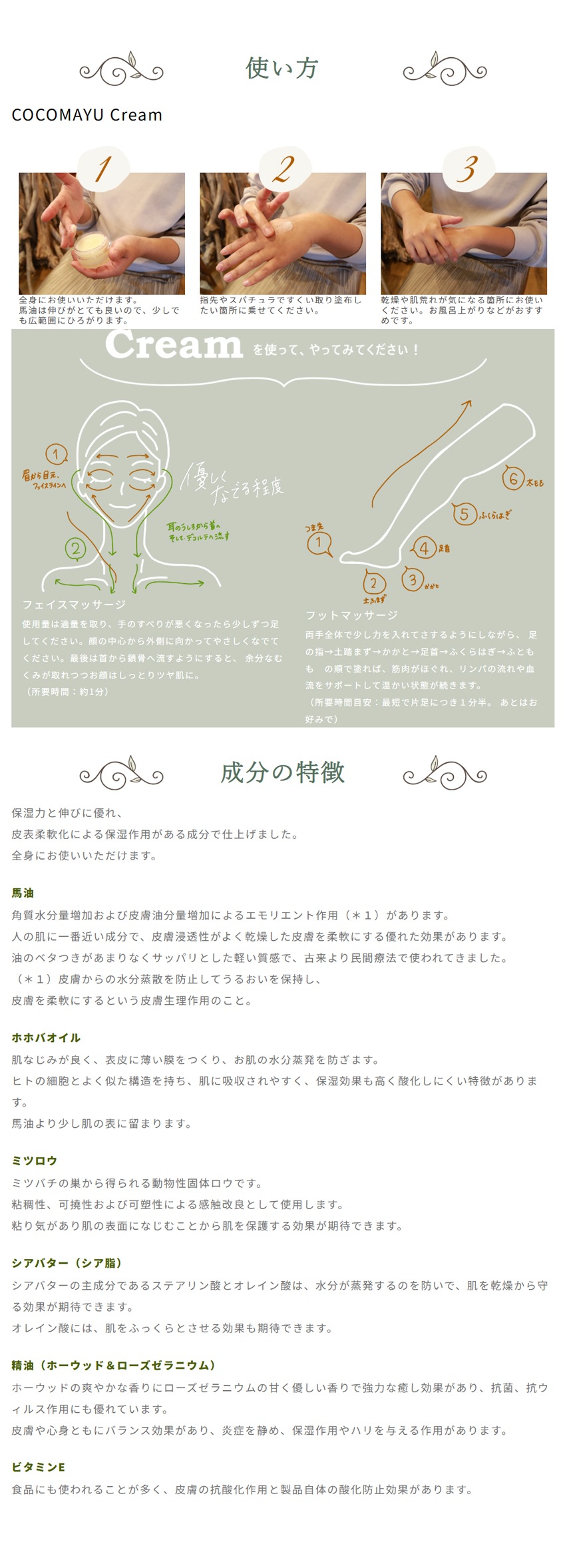 馬油が主体の天然成分のクリームですから、どの成分もそのままに、馬油と同様以上の効果が期待できます。